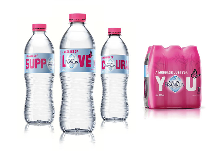 Brandul Mount Franklin a lansat un ambalaj special pentru o campanie impotriva cancerului la san ce are loc in Australia. Designul propus este unul simplu, constand intr-o modificare a etichetei (culoare, font) dar si a foliei baxurilor. Acum eticheta transmite un call-to-action in care si brandul si consumatorul sunt implicati. Culoarea este reprezentativa pentru lupta impotriva cancerului la san la nivel international.