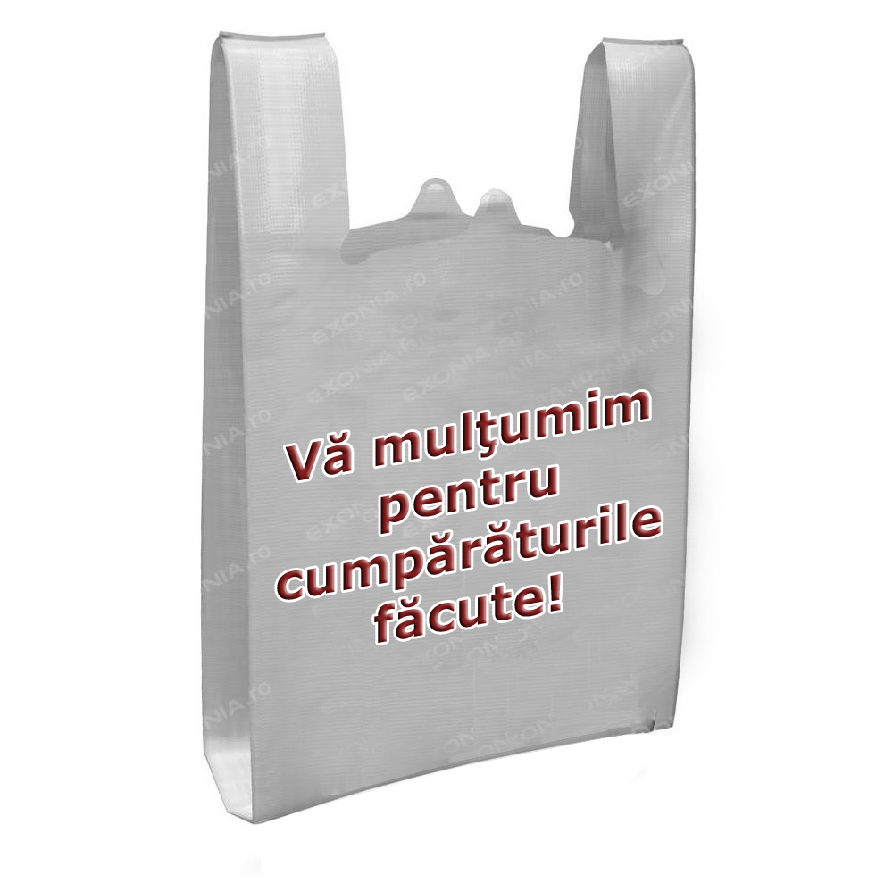Sacosa maieu personalizata standard cu Va multumim pentru cumparaturi copyToate afacerile au nevoie de sacose  pentru clientii lor. Sacosele de cumparaturi cu personalizare standard furnizate de Fabrica De Ambalaje Exonia Holding sunt perfecte pentru diferite domenii de aplicabilitate, fiind o solutie competitiva pentru zona FMCG.
