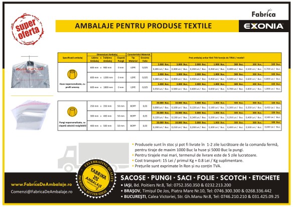 Fabrica De Ambalaje EXONIA furnizeaza ambalaje pentru industria textila: pungi cu clapeta adeziva din polietilena (LDPE) sau pungi cu clapeta adeziva din polipropilena (BOPP, celofan) si huse din polietilena pentru protectia hainelor pe umeras (numite si huse pentru curatatorii de haine).